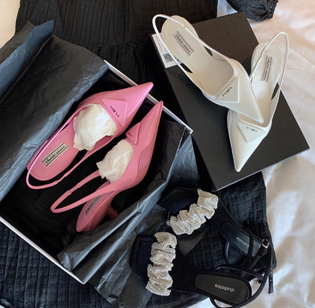 Women's triangle logo sandals with pointed toe trendy high heels